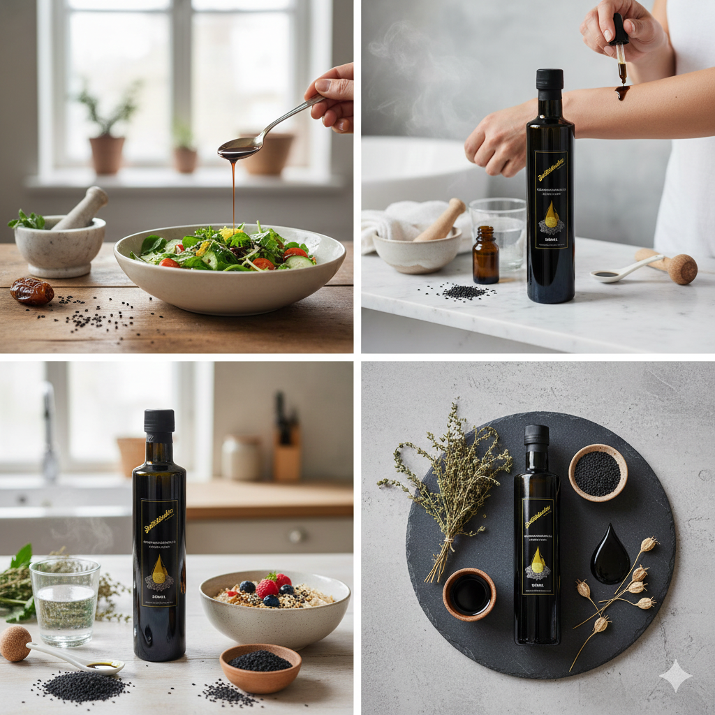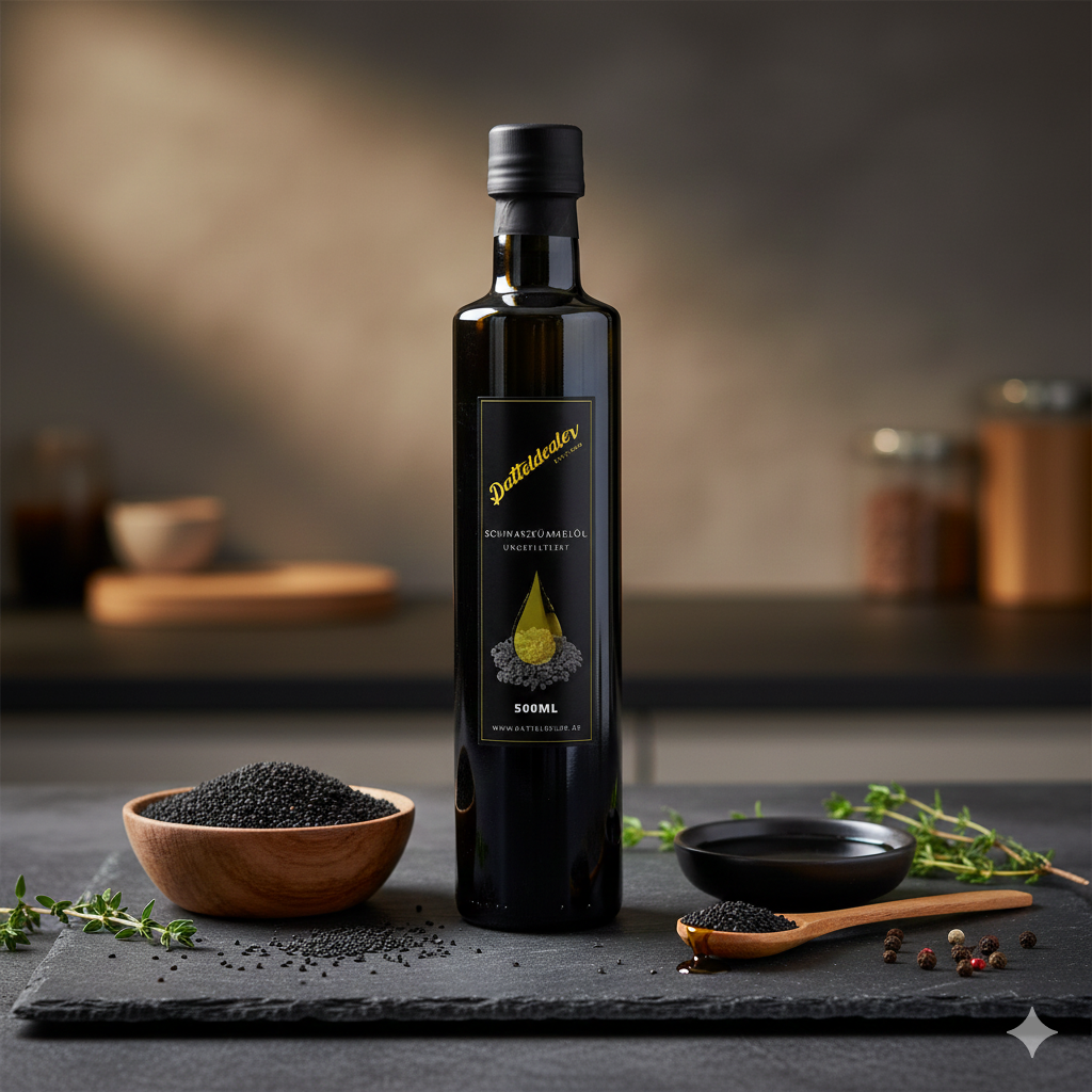 Schwarzkümmelöl hat ein intensives, würziges Aroma und eignet sich hervorragend zum Verfeinern. Viele nutzen es klassisch in Salaten, Dips, Bowls oder als Finish über fertigen Speisen. Wenn du es zum ersten Mal nutzt, starte am besten mit kleinen Mengen – das Aroma ist charakterstark.
